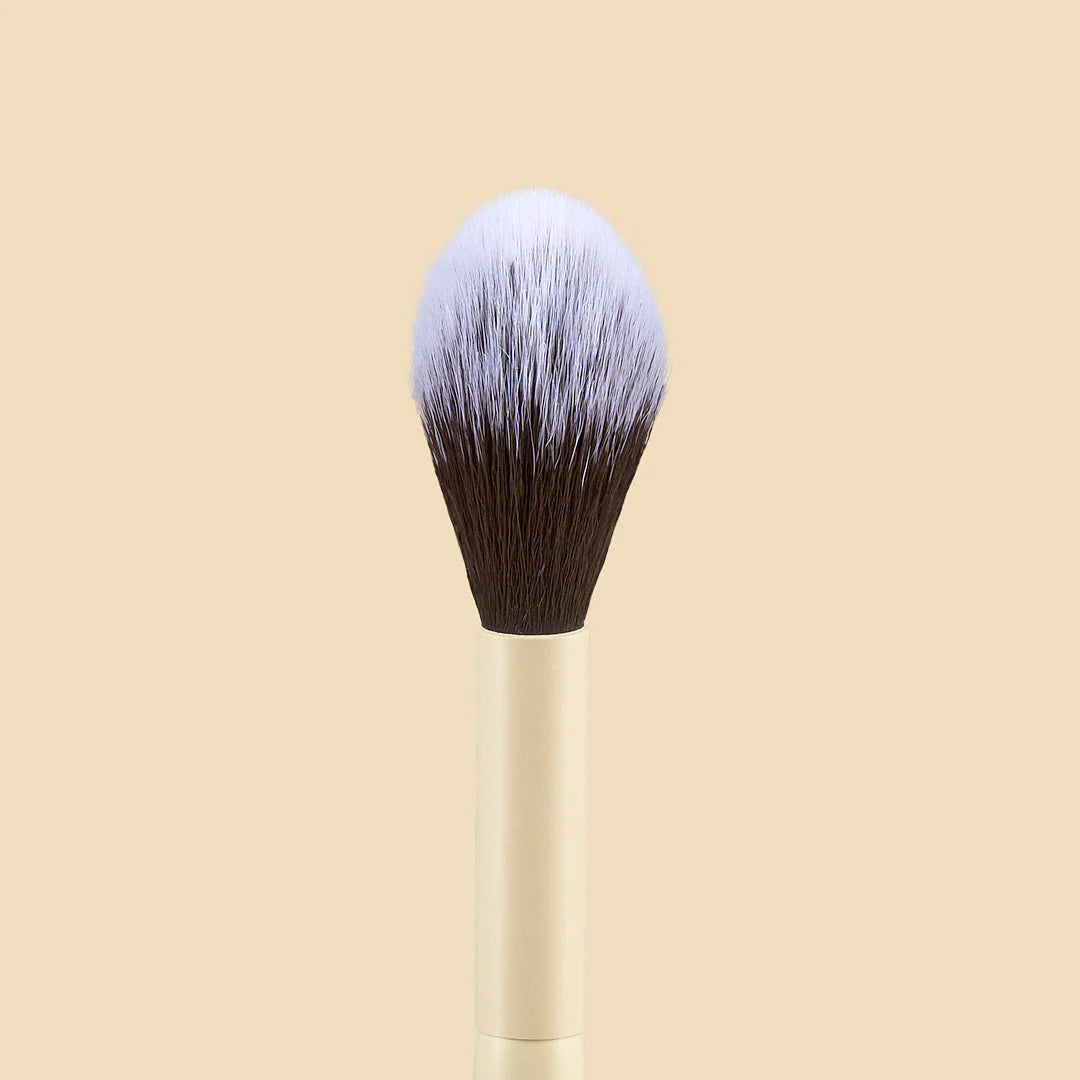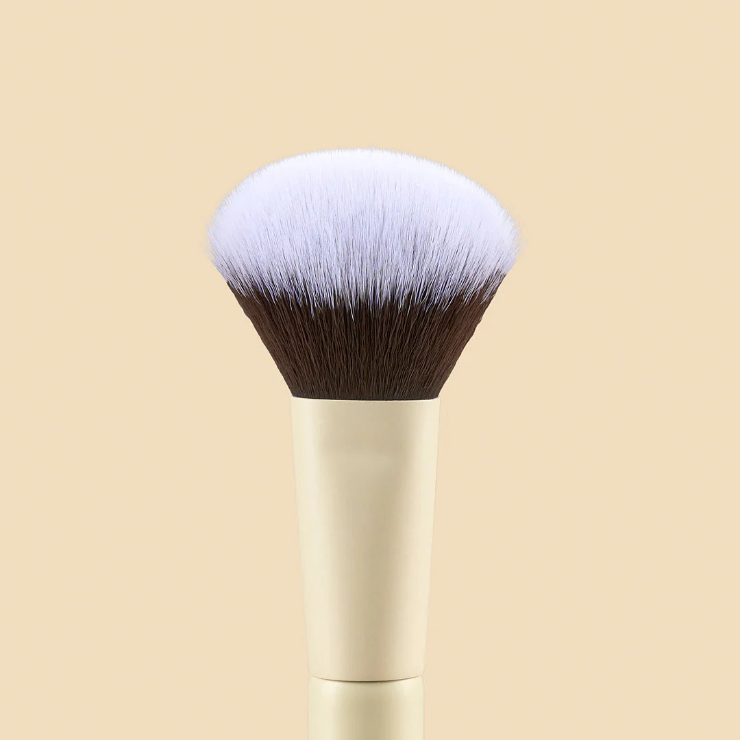 En el otro extremo, incorpora una brocha perfecta para aplicar polvo suelto en zonas pequeñas y precisas, como el contorno de ojos, aletas de la nariz o zonas de retoque. Su forma permite sellar el maquillaje sin sobrecargarlo, dejando un efecto unificado y profesional.