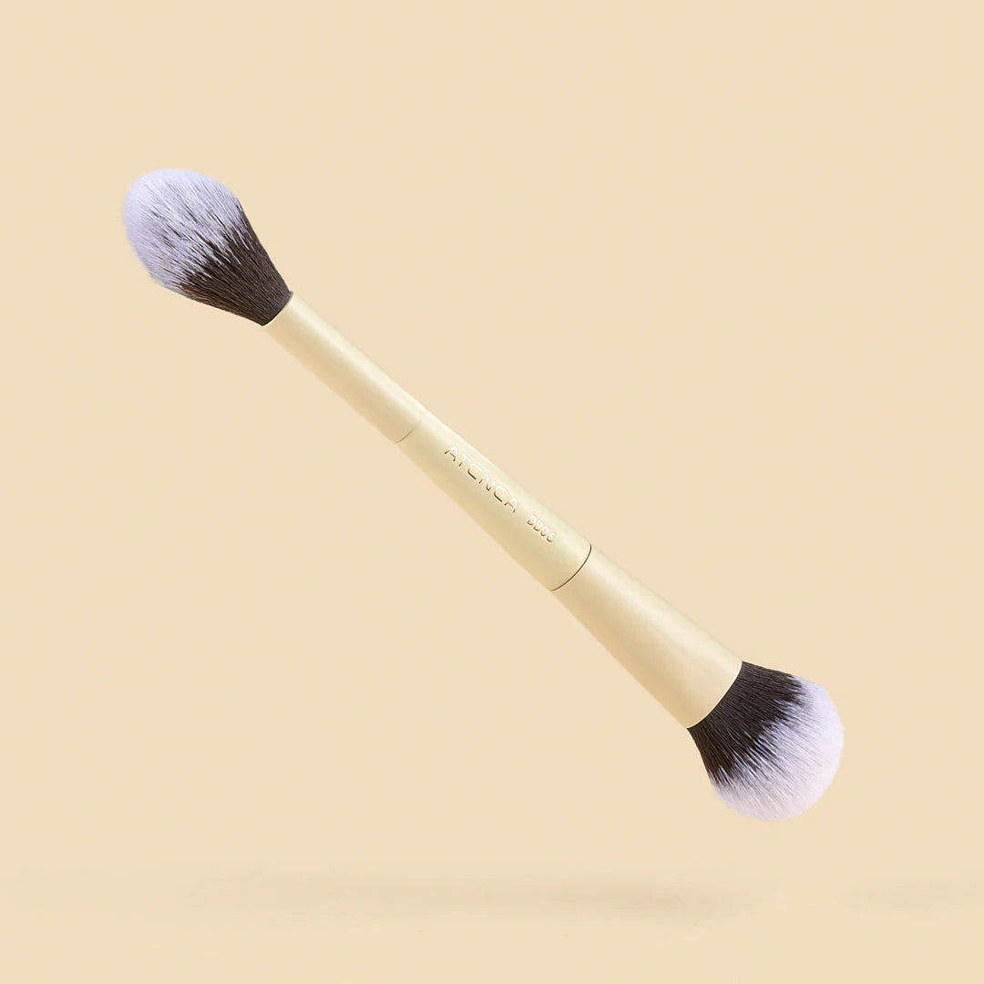Brocha para iluminador Atenea y brocha para polvo suelto Atenea dual está pensada para brindar precisión y armonía en el maquillaje del rostro.
