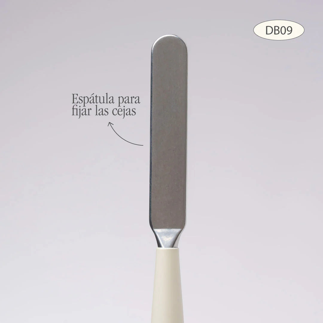La espátula Atenea complementa perfectamente el trabajo: sirve para aplanar las cejas durante el proceso de laminado, logrando mayor fijación y dirección del vello. Además, es una herramienta versátil que puedes usar para tomar y depositar productos en crema sobre la piel de manera higiénica y precisa, antes de difuminar con brochas o esponjas.