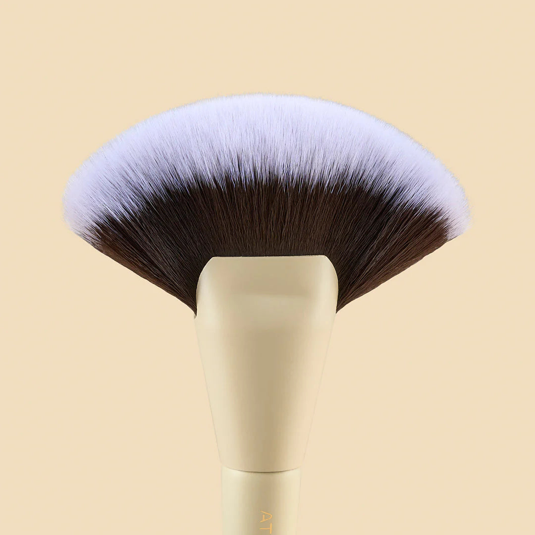 La brocha abanico Atenea es perfecta para quienes disfrutan de un iluminador marcado y con efecto amplio. Su forma delgada y extendida permite aplicar el producto sobre los pómulos de manera uniforme y elegante. Además, es ideal para retirar el exceso de polvo suelto sin alterar el maquillaje aplicado.