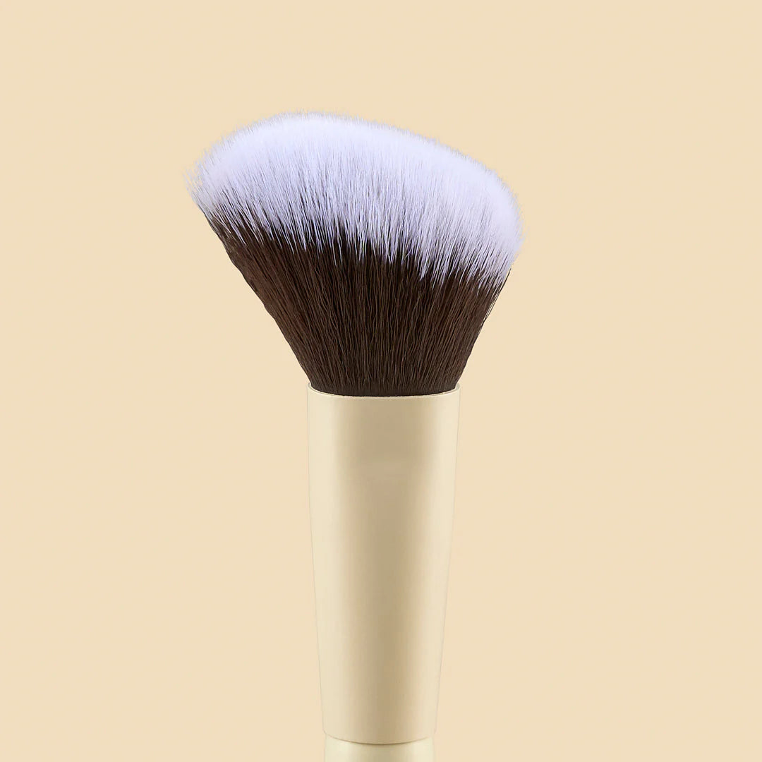 Por su parte, la brocha biselada Atenea destaca por su precisión y versatilidad. Su corte angular facilita la aplicación de contorno en crema o en polvo, adaptándose perfectamente a los ángulos del rostro. También es una favorita de muchos para aplicar rubor, gracias a su forma que deposita el producto justo donde se necesita, logrando un acabado definido y profesional.